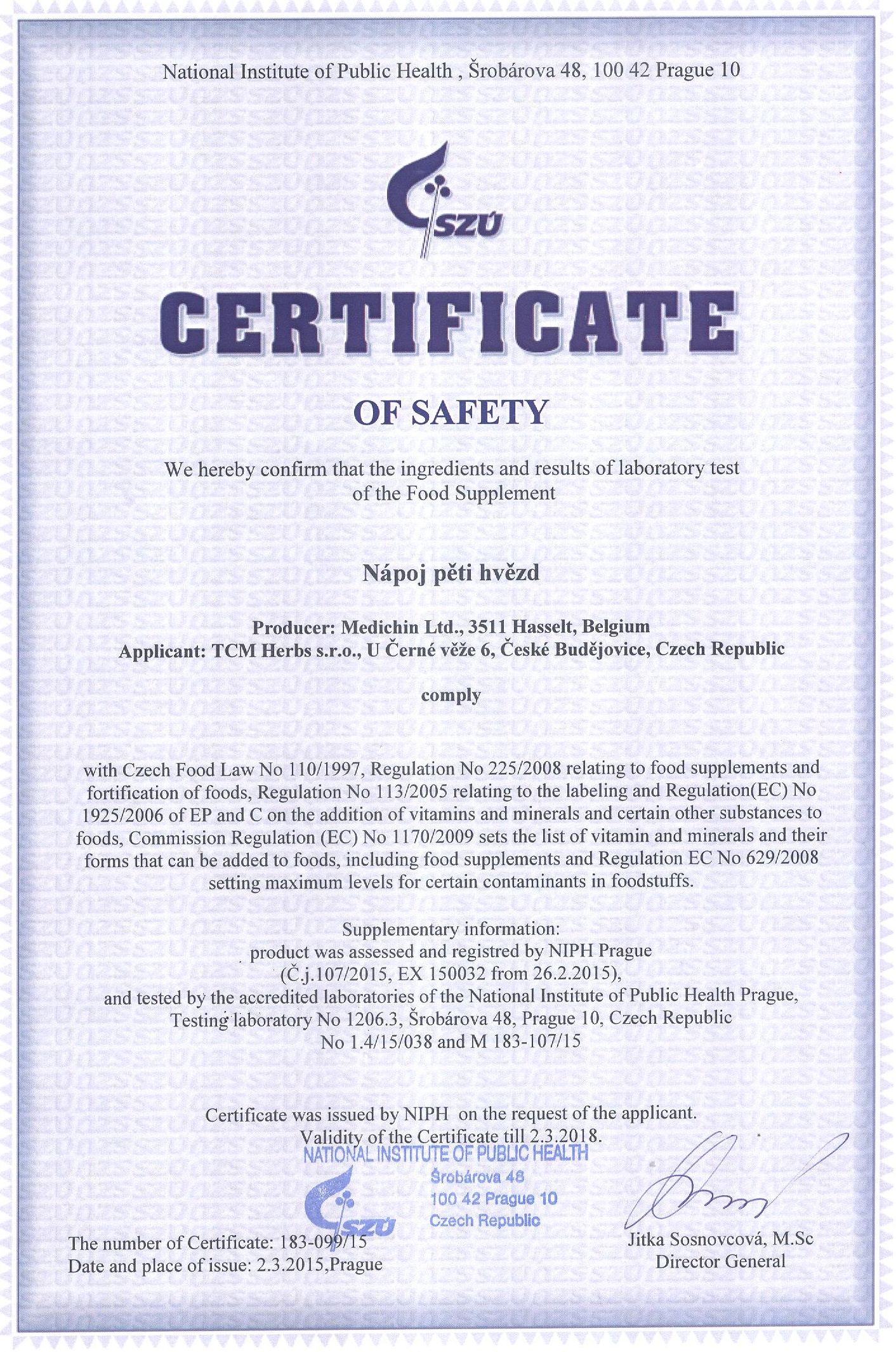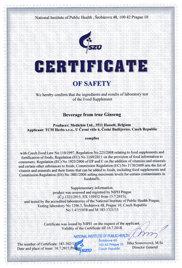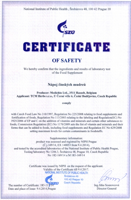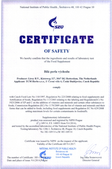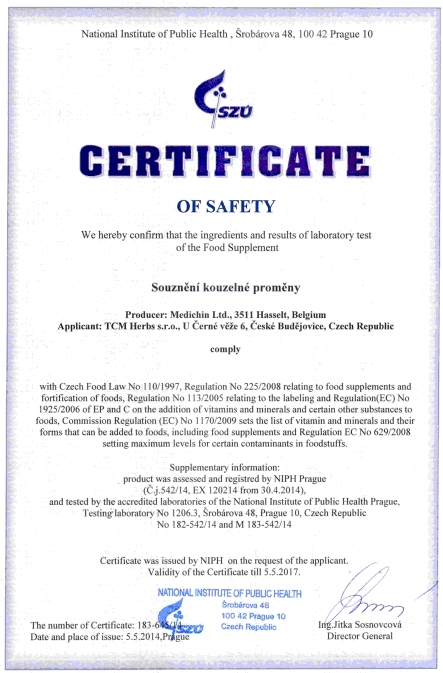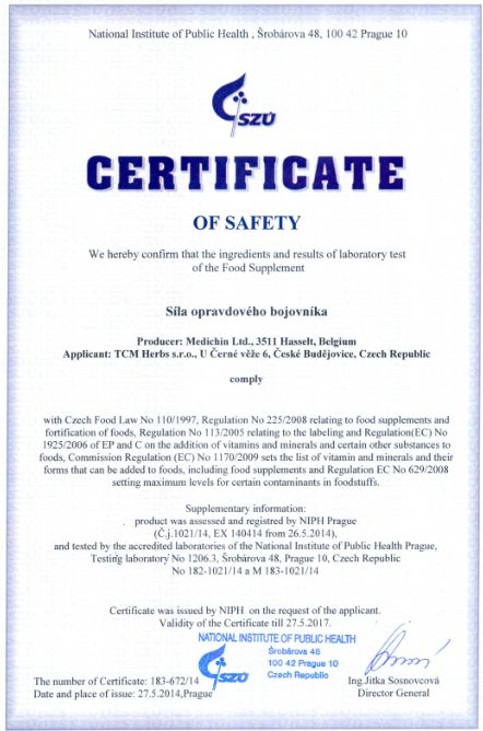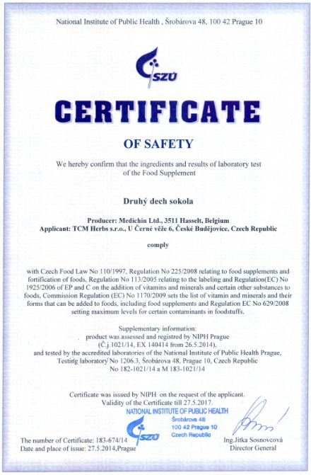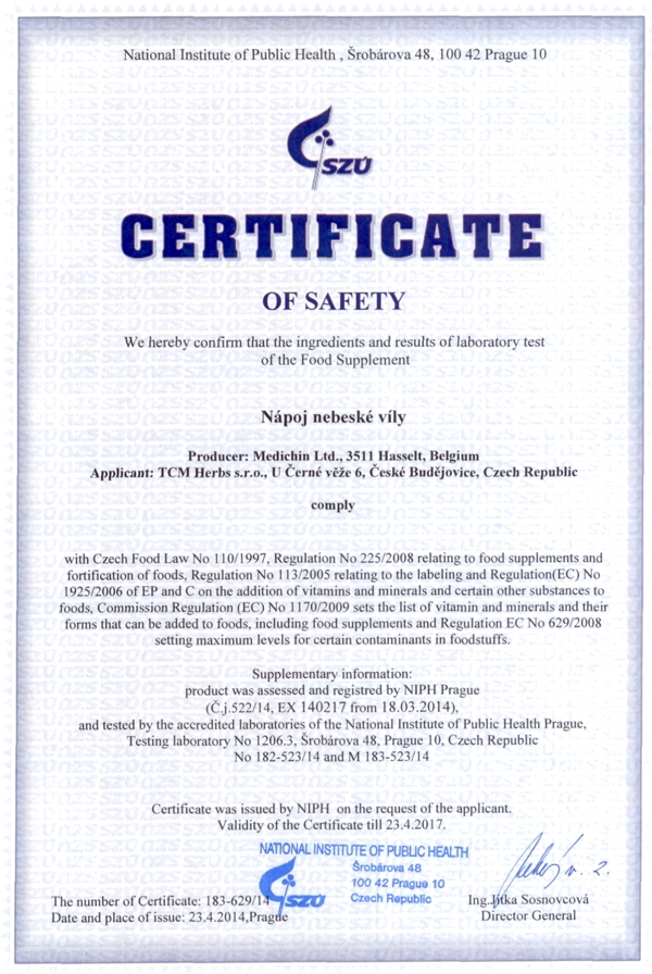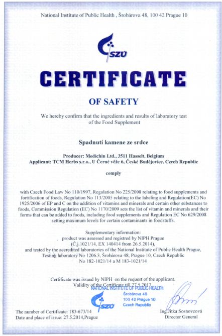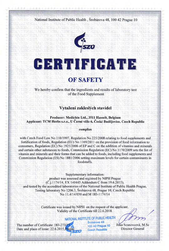 Genehmigung von dem Staatlichen Gesundheitsinstitut (SZÚ) und vom Gesundheitsministerium (Gesundheitsministerium der Tschechischen Republik) über die Gesundheitsunbedenklichkeit der Kräutertabletten