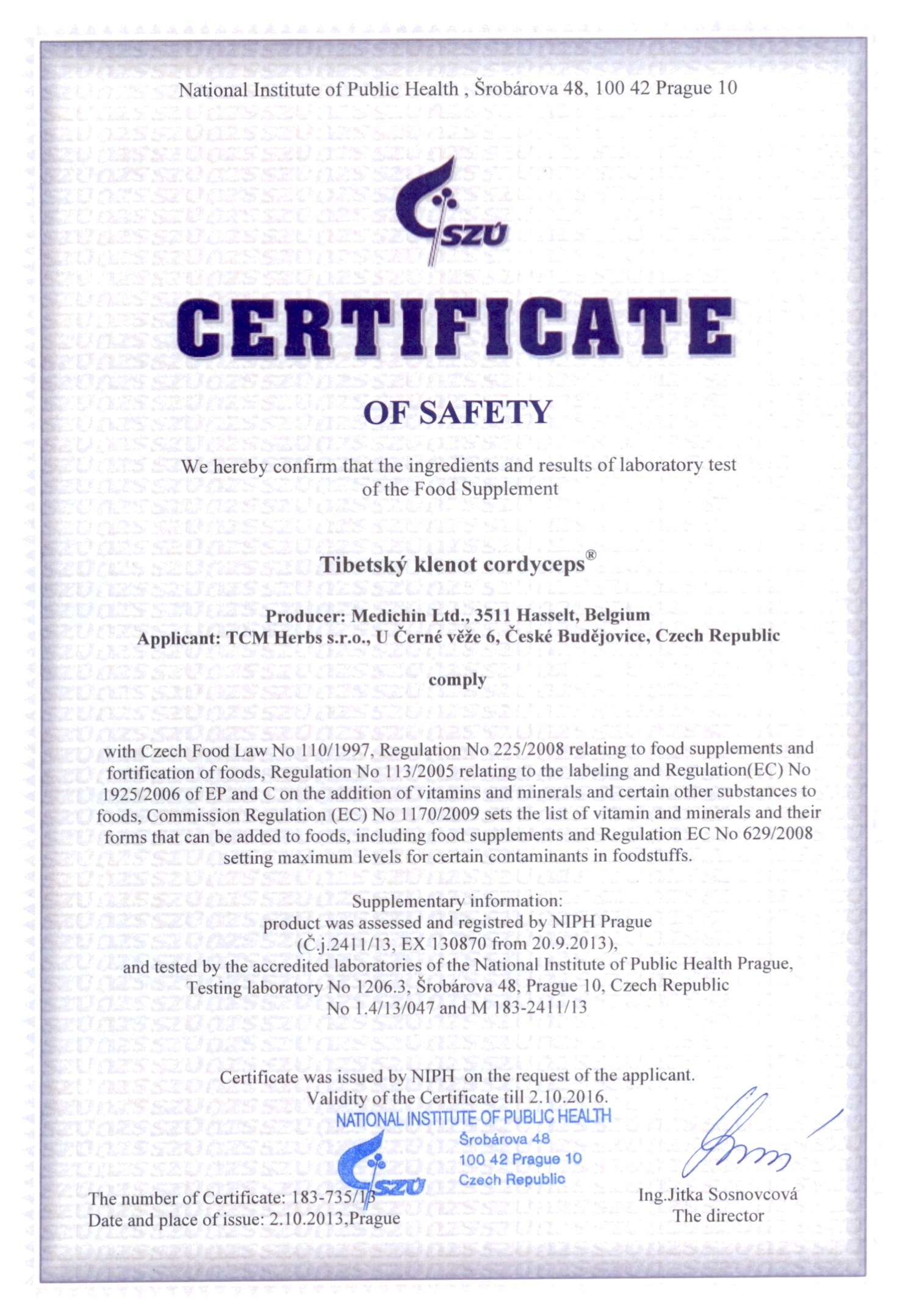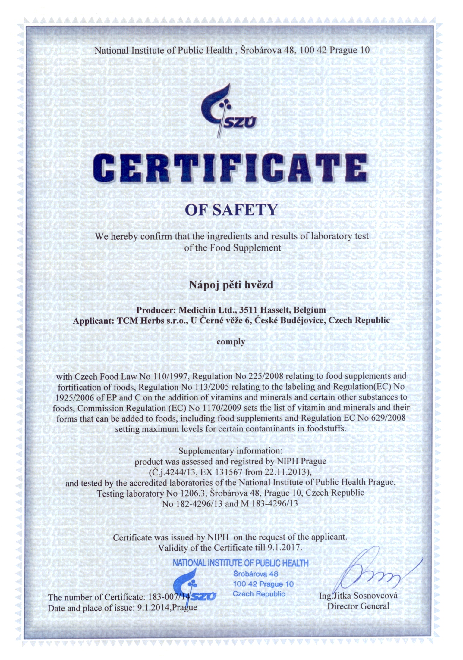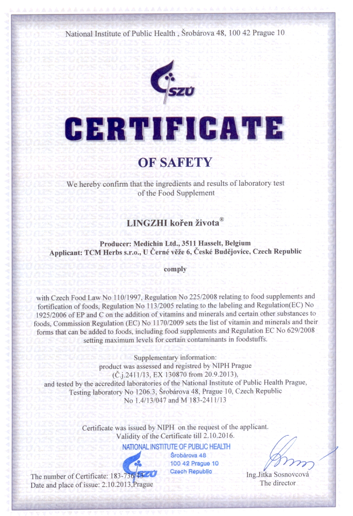 Genehmigung von dem Staatlichen Gesundheitsinstitut (SZÚ) und vom Gesundheitsministerium (Gesundheitsministerium der Tschechischen Republik) über die Gesundheitsunbedenklichkeit der Kräutertabletten